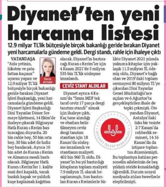 22 Kasım yayınladığı bir haberinde Diyanet İşleri Başkanlığı’nın bütçesini 16 milyar olarak yazan Sözcü gazetesi, 1 Aralık 2021'de yani bugün yaptığı haberde ise indirim yaparak 12.9 milyar TL yazdı.