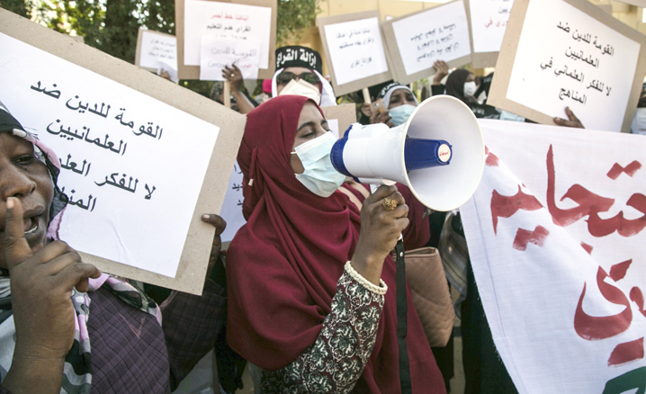 Başkent Hartum’daki Eğitim Bakanlığı önünde toplanan farklı mesleklerden çok sayıda kadın, "Sudan Kur'an ülkesidir. Michelangelo, bizi temsil etmiyor. Din, kırmızı çizgimizdir, İslam'a aykırı müfredata hayır!" yazılı pankartlar taşıdı.