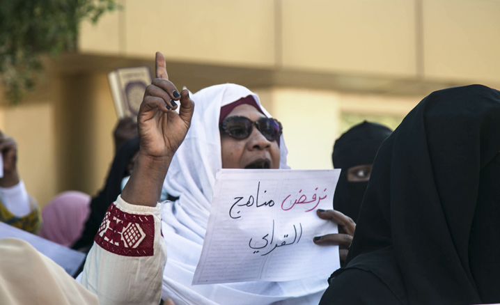 Grup, tablonun ders kitaplarına alınması kararına imza atan Sudan Müfredat ve Eğitim Araştırmaları Müdürü Ömer Ahmed el-Karray'ın görevden alınması yönünde sloganlar attı.