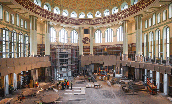 Her bir bölümü en ince ayrıntısına kadar düşünülen caminin içerisindeki boyama işlemlerinde sona gelindi. Namaz alanı ahşap duvar kaplamaları ve camlara korkuluk takma işleri tamamlanıyor. Caminin ana kubbesi için kurulan iskele de söküldü.