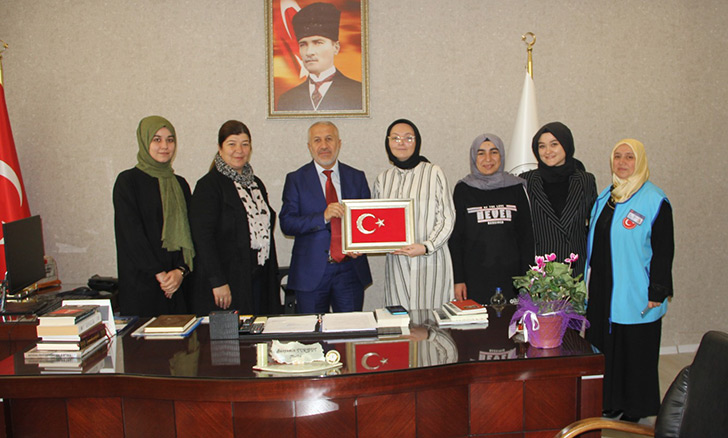 Ziyarette Yurt Müdürü Polat tarafından Müftü Turgut’a el emeği Filografi çalışması olan Türk Bayrağı takdim edildi.