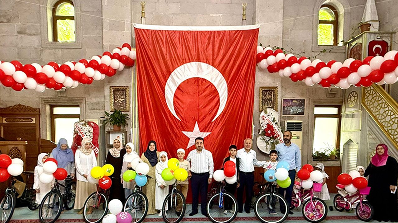 Protokol konuşmaları sonrası Hz. Ömer Faruk Camii ve Kur’an Kursu’nda dereceye giren öğrencilere bisiklet hediye edildi.