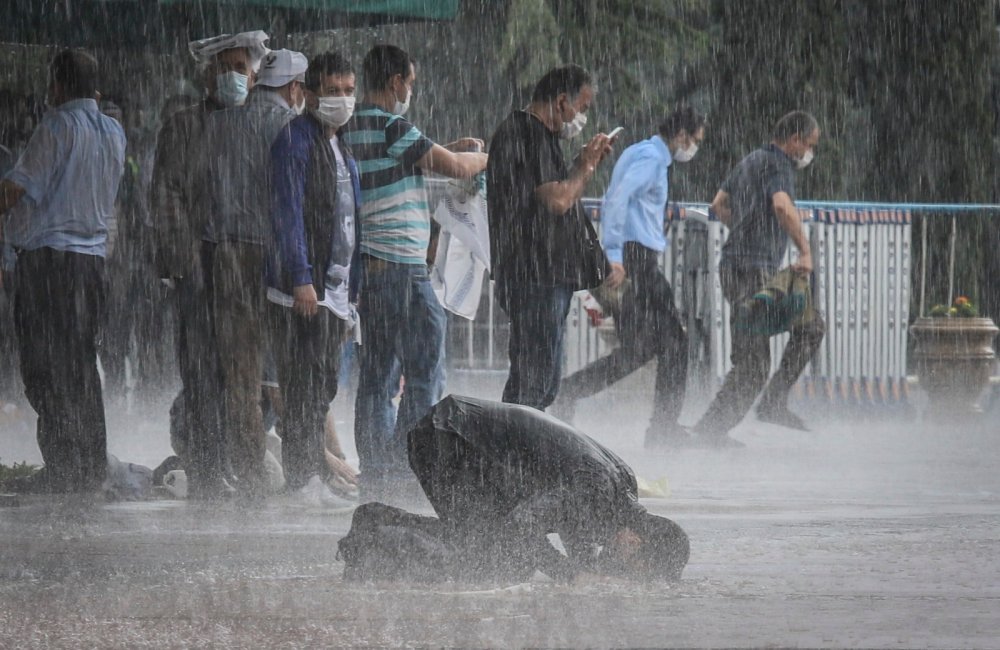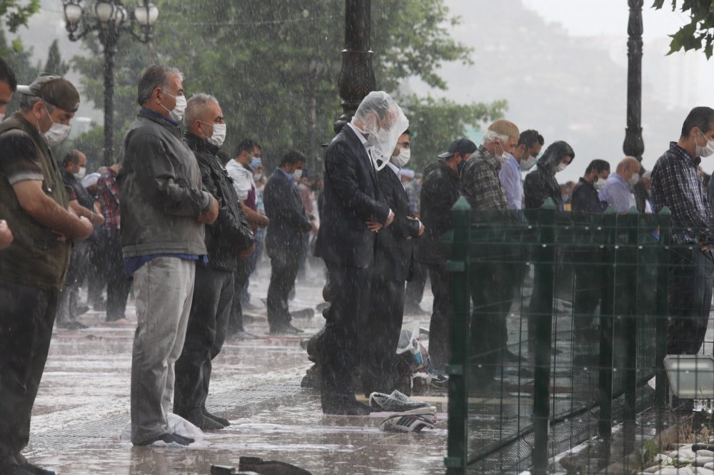 Açık havada namaz kılmak için gelen vatandaşlar, sosyal mesafeye uyarak yanlarında getirdikleri seccadeleri serip meydanda saf tuttu. Gece saatlerinden itibaren aralıklarla devam eden yağmur, namaz sırasında yeniden başladı.