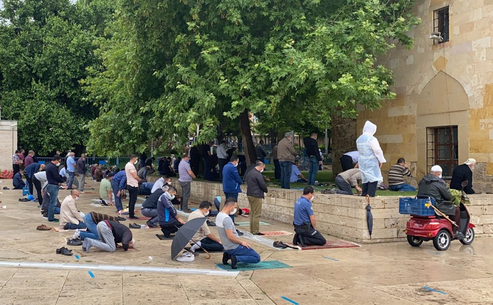 Namaz öncesinde vatandaşların saf alırken, sosyal mesafeye uydukları, maskelerini taktıkları görüldü.