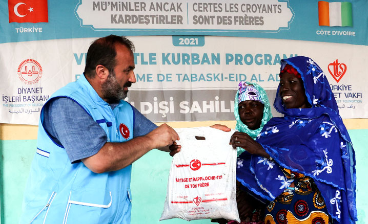 Türkiye Diyanet Vakfının (TDV) "Kurbanını paylaş, kardeşinle yakınlaş" sloganıyla düzenlediği vekalet yoluyla kurban kesim organizasyonu kapsamında Batı Afrika ülkesi Fildişi Sahili'nde kesilen kurbanların etleri 40 bin aileye dağıtıldı.