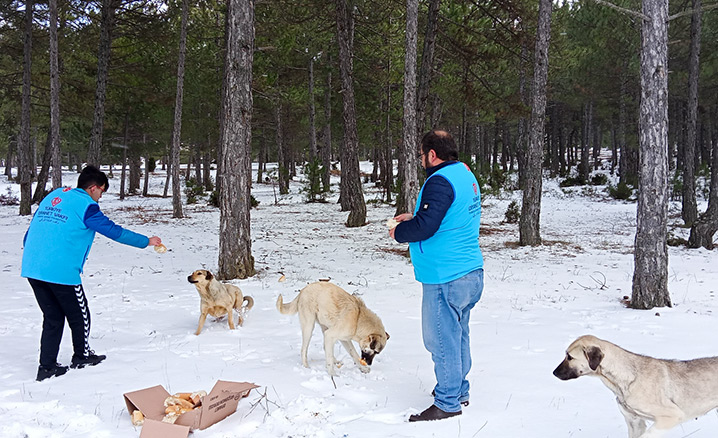 Türkiye Diyanet Vakfı (TDV) Tavşanlı Şubesi Kadın ve Gençlik Koordinatörlüğü gönüllüleri, kış şartları nedeniyle yiyecek bulmakta zorlanan hayvanlar için yem ve mama bıraktı.
