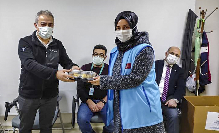 Türkiye Diyanet Vakfı (TDV) Eskişehir Şubesi Kadın Kolları, yeni tip koronavirüs (Kovid-19) salgınında görev yapan sağlık çalışanlarına moral ziyareti yaptı, yemek ikramında bulundu.