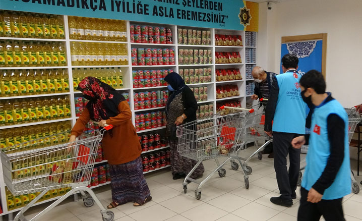 Koronavirüs tedbirleri eşliğinde faaliyet gösteren İyilik Çarşısı'na gelen vatandaşlara hayırseverlerin destekleri ile hazırlanan gıda malzemelerinden ihtiyaç duyduklarını ücretsiz olarak alabiliyor.
