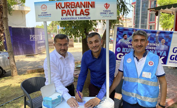 Çukurova İzzettin İsmail Gözübatık Camii İmam Hatibi Alişadi Özdoğan, mahalle muhtarıyla birlikte Diyanet İşleri Başkanlığı ile Türkiye Diyanet Vakfı iş birliğinde, "Kurbanını Paylaş, Kardeşinle Yakınlaş" sloganıyla sürdürülen vekaletle kurban kesim organizasyonu kapsamında vekalet yoluyla kurban bağışında bulundu.