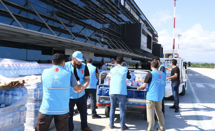 TDV görevlileri tarafından Sinop Havaalanı'nda helikopterlere yüklenen su başta olmak üzere acil yardım malzemeleri, ulaşıma kapalı bölgelerdeki selzedelere taşındı.