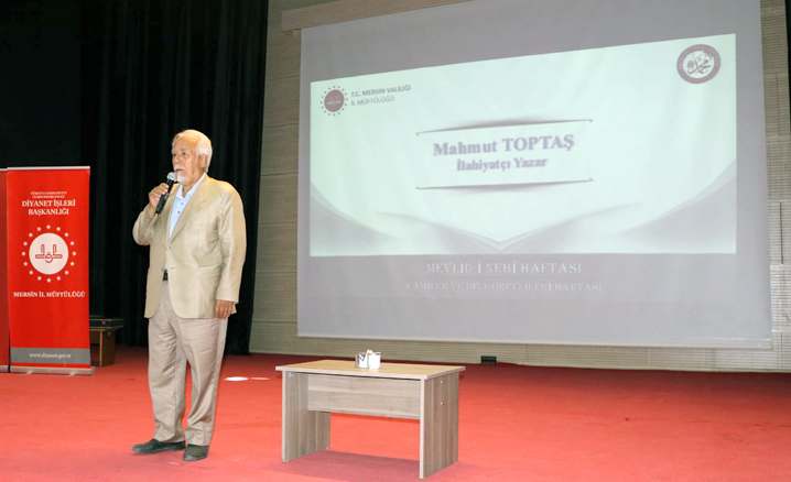 Toroslar Belediyesi Yunus Emre Kültür Merkezi Konferans Salonu’nda düzenlenen konferansa, İlahiyatçı Yazar Mahmut Toptaş konuşmacı olarak katıldı.