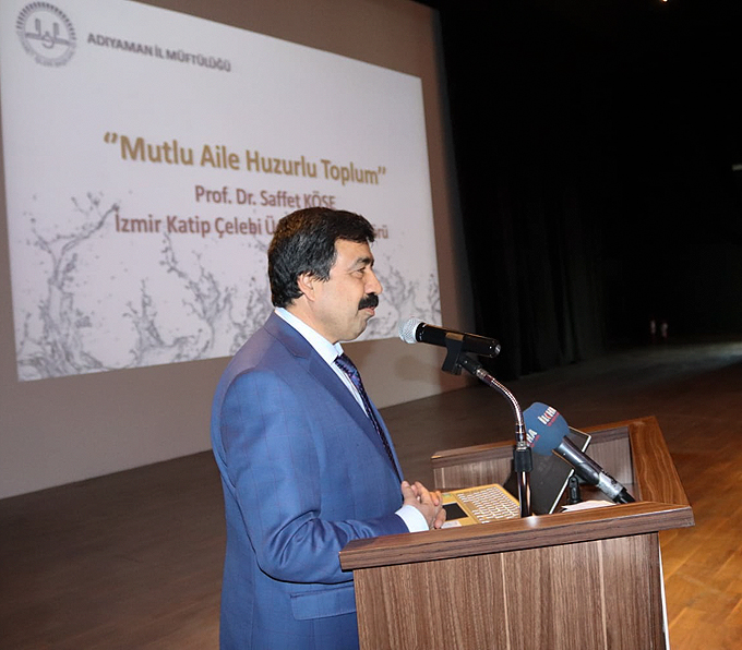 Adıyaman İl Müftülüğünce düzenlenen “Mutlu Aile Huzurlu Toplum” konulu konferansa, İzmir Kâtip Çelebi Üniversitesi Rektörü Prof. Dr. Saffet Köse konuşmacı olarak katıldı.