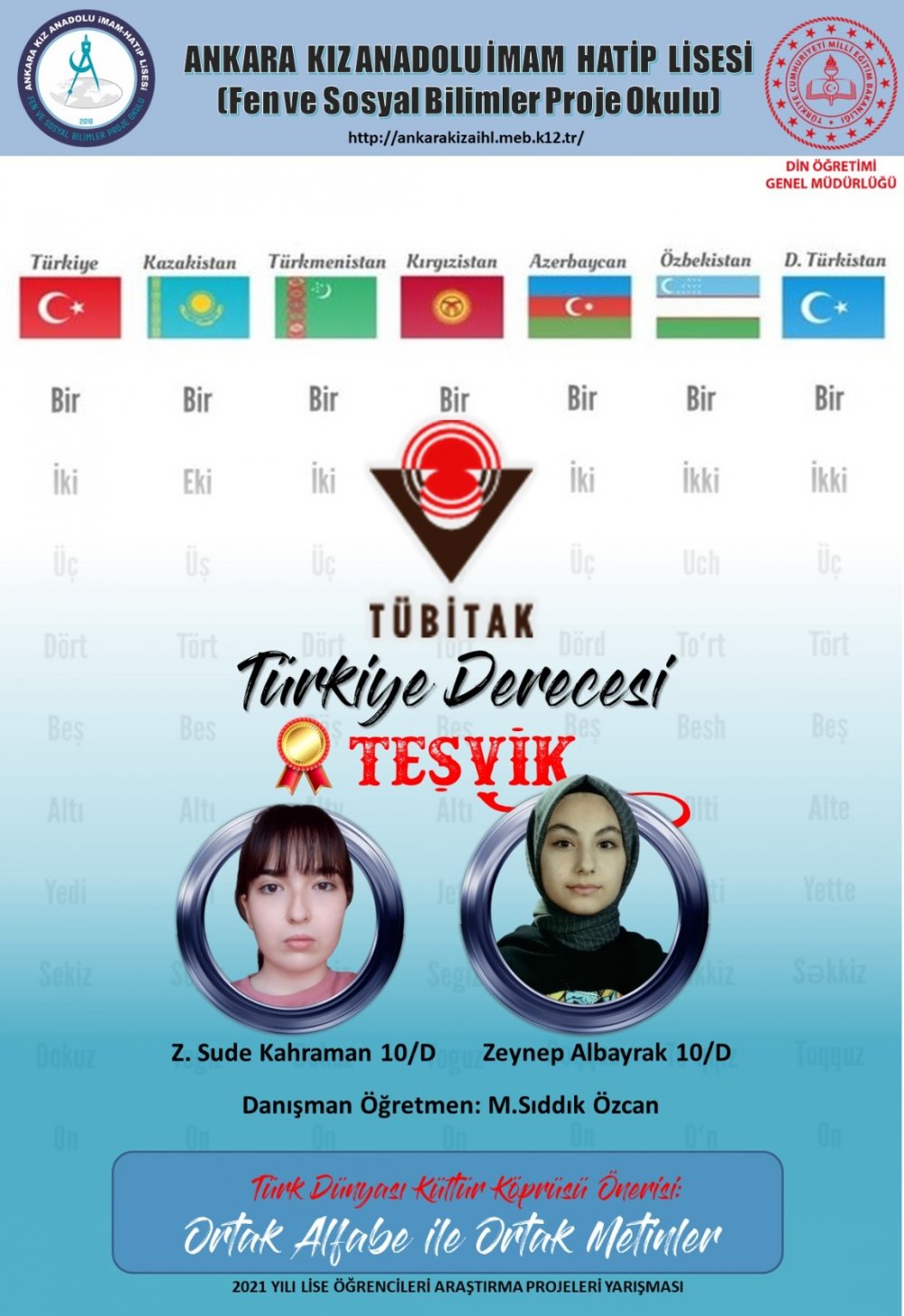 Bu kapsamsa; Altındağ Kız Anadolu İmam Hatip Lisesi Fen ve Sosyal Bilimler Proje Okulu öğrencilerinden Zeynep Albayrak ile Zeliha Sude Kahraman,“Türk Dünyası Kültür Köprüsü Önerisi: Ortak Alfabe İle Ortak Metinler” adlı projeleriyle teşvik ödülünün sahibi oldu.
