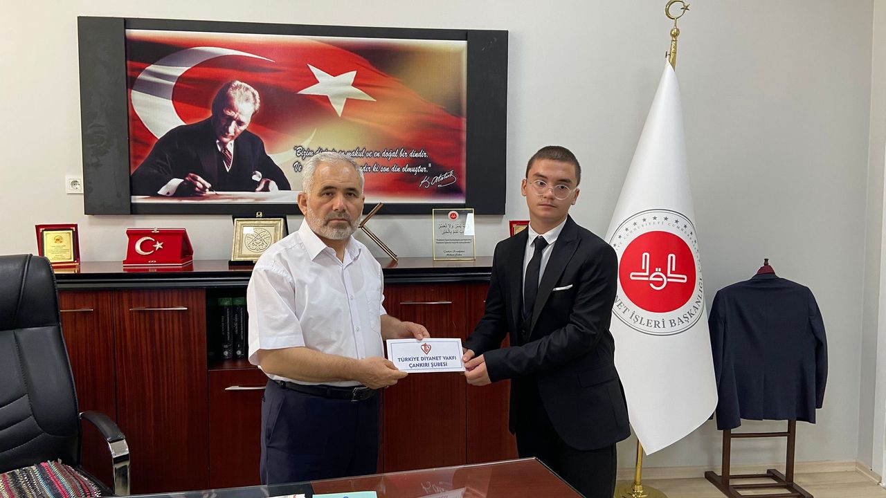 Çankırı İl Müftüsü Mehmet Şahin, Türkiye birincisi olan Seydi Üngör’ü başarısından dolayı tebrik ederek ödülünü takdim etti.