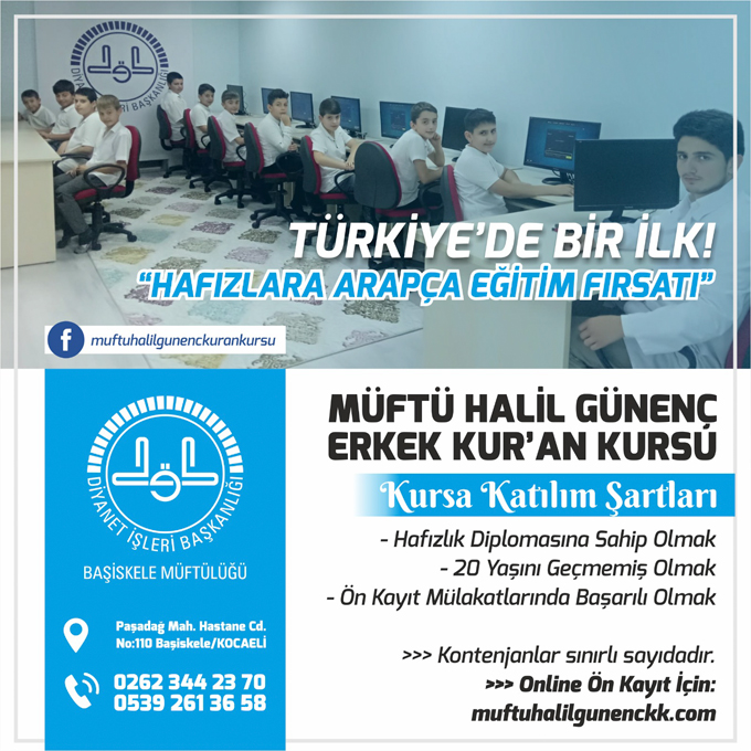 Diyanet İşleri Başkanlığınca geçtiğimiz yıl sekiz ilde pilot uygulama olarak başlatılan “Arapça Kur’an-ı Anlama Temel Eğitim Programı” kapsamında, Başiskele İlçe Müftülüğüne bağlı Müftü Halil Günenç Yatılı Erkek Kur'an Kursu bünyesinde açılacak “Arapça Kur’an-ı Anlama Temel Eğitim Programı”na ön mülakat ile öğrenci alınacak.