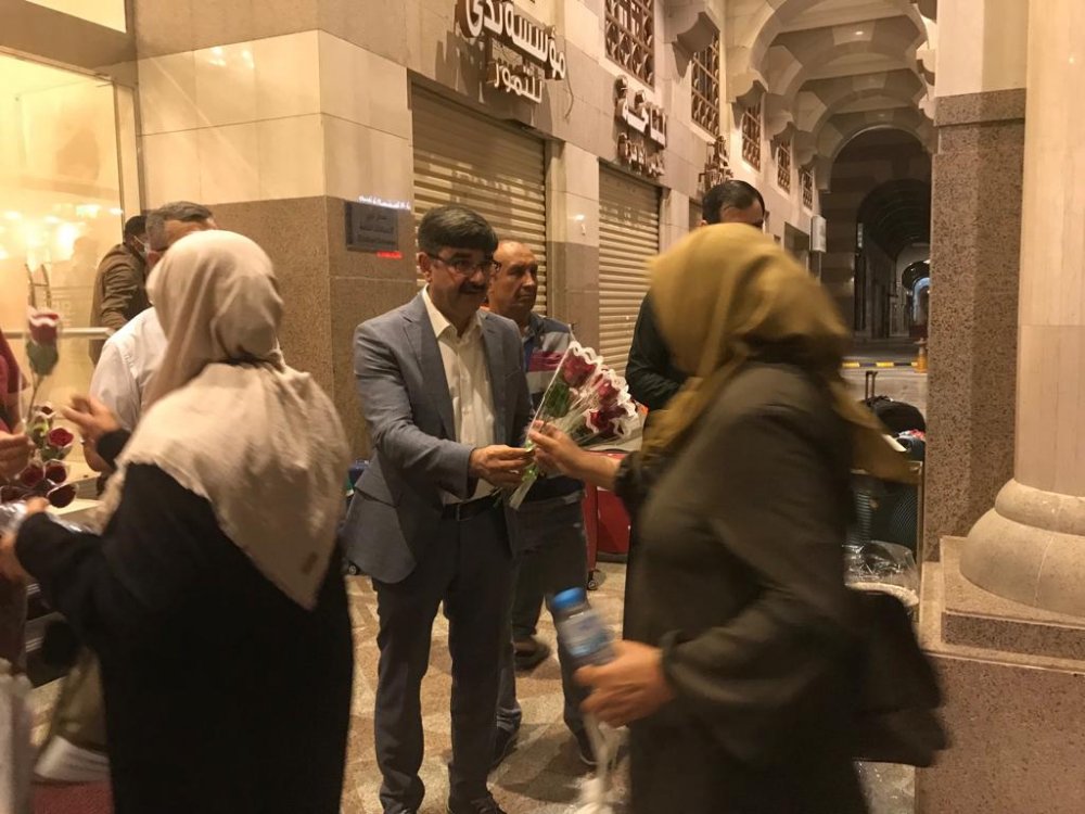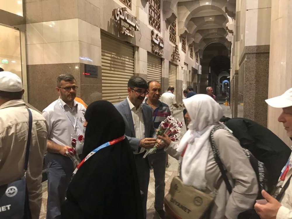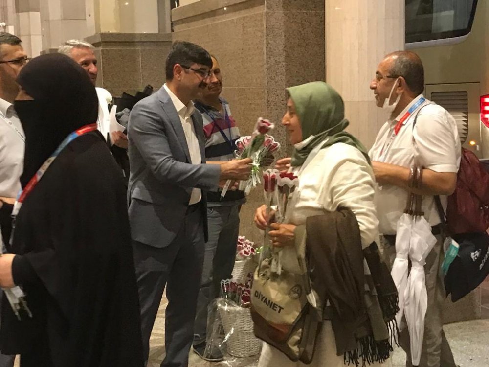 Zemzem ve güllerle karşılanan hacı adaylarına Medine Koordinasyon ve İskan Ekip Başkanı Muhammed Zeyd Özel, Kargo Ekip Başkanı Zeynel Abidin Akduman, Havalimanı Ekip Başkanı Uğur Yılmaz ve Bölge sorumluları eşlik etti.