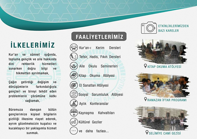 Açılan stantta görevlendirilen personel tarafından üniversiteye kayıt yaptırmak üzere gelen öğrencilere Kocaeli Üniversitesi Sosyal Tesisler içerisinde bulunan Kocaeli Diyanet Gençlik Aile ve Dini Rehberlik Büroları ve gençlere yönelik yapılan çalışmalar, haftanın 5 günü devam eden dersler hakkında bilgi verildi.