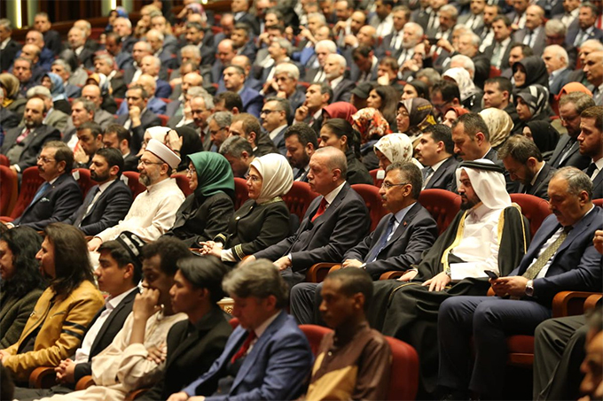“Yurt içinde ve yurt dışında inşa ettiğimiz binlerce cami ve Kur’an kursu ile yürekleri aynı safta, kalpleri aynı hakikatte buluşturmaya gayret etmekteyiz. 67 ülkede 27 dilde 1 milyona yakın Kur’an-ı Kerim hediye ettik. Yemen’e 8,5 milyon TL, Suriye’ye bin 866 tır yardım malzemesi ve 214 milyon TL, Filistin’e 130 milyon TL, Arakan’a 19 milyon TL yardımda bulunduk. 19 ülkede 179 su kuyusu açtık.”