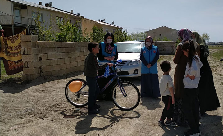 Çocuklara hayırseverler tarafından hediye edilen oyuncaklar ve bisikletler, salgın nedeniyle sokağa çıkmaları sınırlandırılan çocukların evlerine Kur’an kursu öğreticileri tarafından teslim edildi.