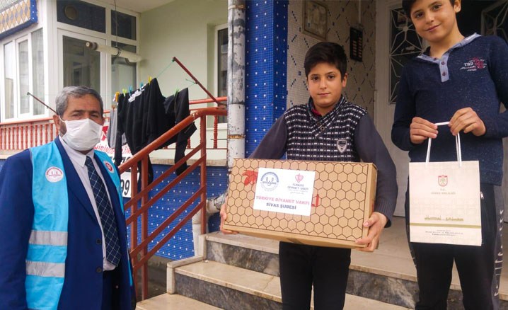 Bu kapsamda Sivas İl Müftülüğü ve Türkiye Diyanet Vakfı Sivas Şubesince hazırlanan yardım kolileri ile Sivas Valiliğince hazırlanan dezenfektan paketleri, ihtiyaç sahibi ailelere ulaştırıldı.
