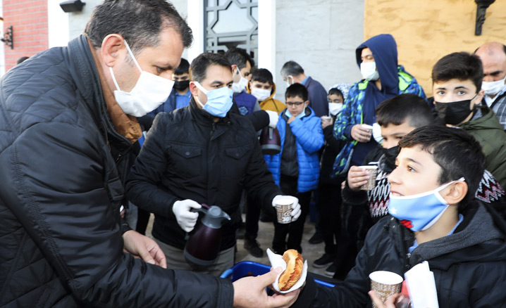 Vali Ayhan namaz sonrası, çocuklara sıcak süt ve poğaça ikram etti.