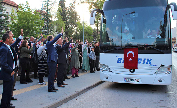 Hac farizasını yerine getirmek üzere Bilecik’ten yola çıkan hacı adayları, Cumhuriyet Meydanı'ndan telbiye, dua ve gözyaşlarıyla uğurlandı.