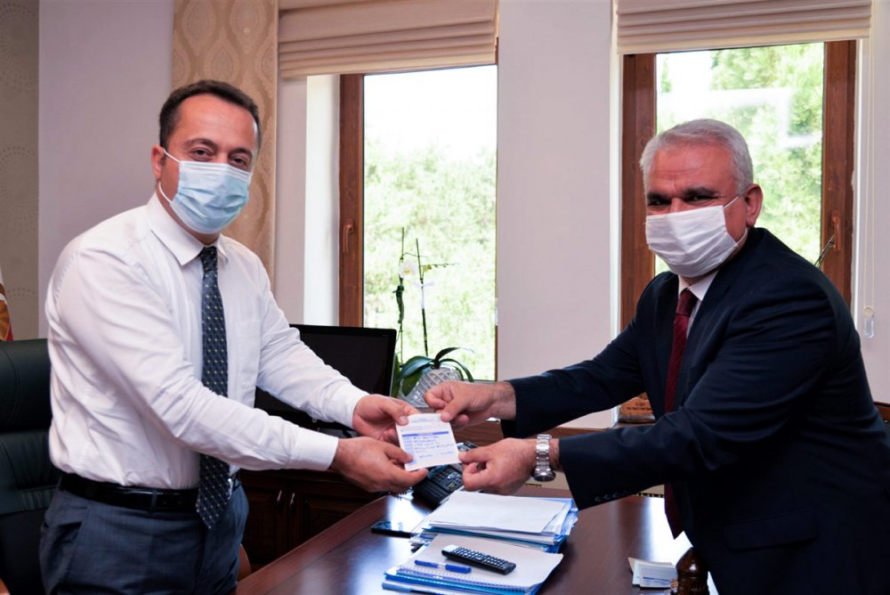 Vali Şentürk’ün kurban vekaletini Türkiye Diyanet Vakfı adına kabul eden İl Müftüsü Ali Erhun, Şentürk'e bağış makbuzunu takdim etti.