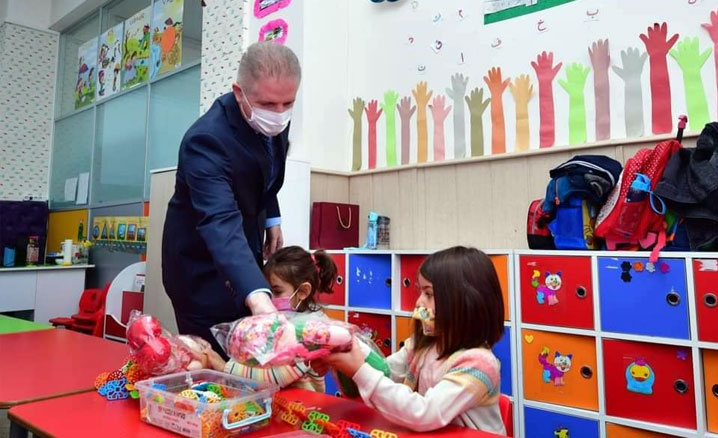 4-6 yaş grubunda eğitim gören miniklerle bir araya gelen Vali Gül, çocuklara çeşitli hediyeler verdi.