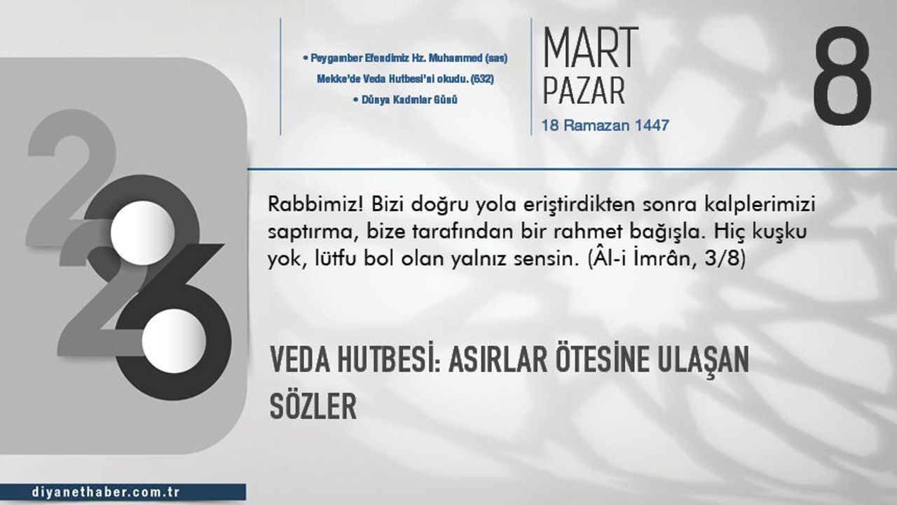 Peygamber Efendimizin, Veda Haccı’nda iken birkaç yerde irat ettiği hutbeler daha sonra tek bir metin hâline getirilip “Veda Hutbesi” adıyla kayıtlara geçmiştir. Veda Hutbesi, Kur’an ve sünnetin Peygamber mirası oluşu; kul hakkı, miras hakkı, ibadetlerin önemi, can, mal ve namus dokunulmazlığı, suçun şahsiliği, aile hukuku, eşler arasındaki haklar ve sorumluluklar, emanet ahlakı, Müslümanların kardeşliği gibi hususların yanı sıra ribâ ve kan davası gibi Cahiliye âdetlerinin kaldırılmasına da vurgu yapar. Arap’ın Arap olmayana, Arap olmayanın da Arap olana hiçbir üstünlüğü olmadığının, üstünlüğün ancak takva ile olduğunun söylendiği, ayrımcılığın ve ırkçılığın reddedildiği Veda Hutbesi’nde Allah’a kulluk, insan hakkı ve onuru öncelenir. Orada bulunanların bulunmayanlara iletmesiyle Veda Hutbesi’ndeki bu evrensel ve kuşatıcı ilkeler o günden bugüne bütün insanlığın vicdanına seslenmektedir.