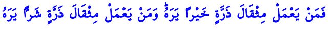 “Kim zerre ağırlığınca bir hayır işlerse onun mükâfatını görecektir. Kim de zerre ağırlığınca bir kötülük işlerse onun cezasını görecektir.”[2]