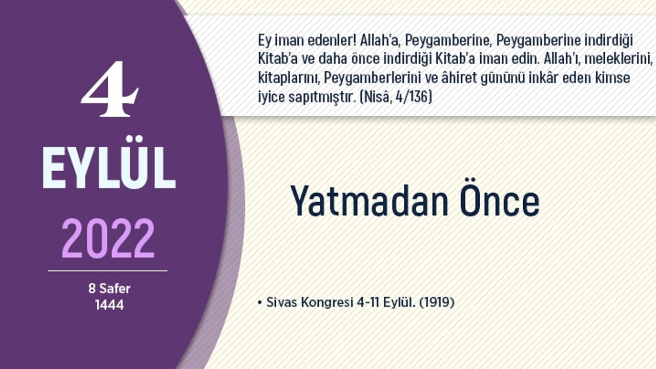 Peygamberimiz (a.s) yatmadan önce şu duayı okumuştur: “Allahım! Kendimi sana teslim ettim. Yüzümü sana çevirdim. İşimi sana ısmarladım. Rızanı isteyerek, azabından korkarak sırtımı sana dayadım, sana sığındım. Sana karşı yine senden başka sığınak yoktur. İndirdiğin kitaba ve gönderdiğin peygambere inandım.” (Buhârî, Daavât, 5)