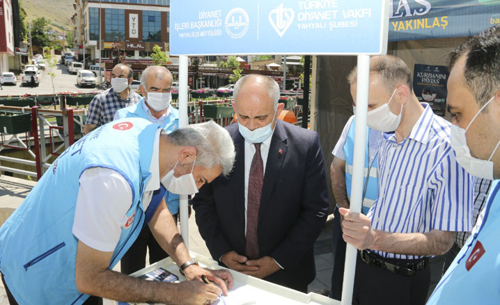 Türkiye Diyanet Vakfı Yahyalı Şubesi tarafından Yahyalı Cumhuriyet Meydanı’nda kurulan Kurban Bağış ve Tanıtım Standı'nı ziyaret eden Yahyalı Belediye Başkanı Esat Öztürk ve Kaymakam Yunus Emre Altıner, Türkiye Diyanet Vakfına vekalet yoluyla kurban bağışında bulundu.