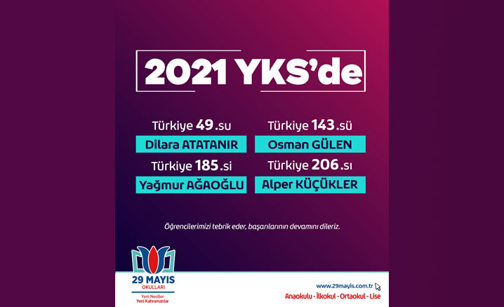 29 Mayıs Okulları, LGS’de elde edilen Türkiye şampiyonluğunun ardından 2021 YKS'de de başarılarını sürdürdü.