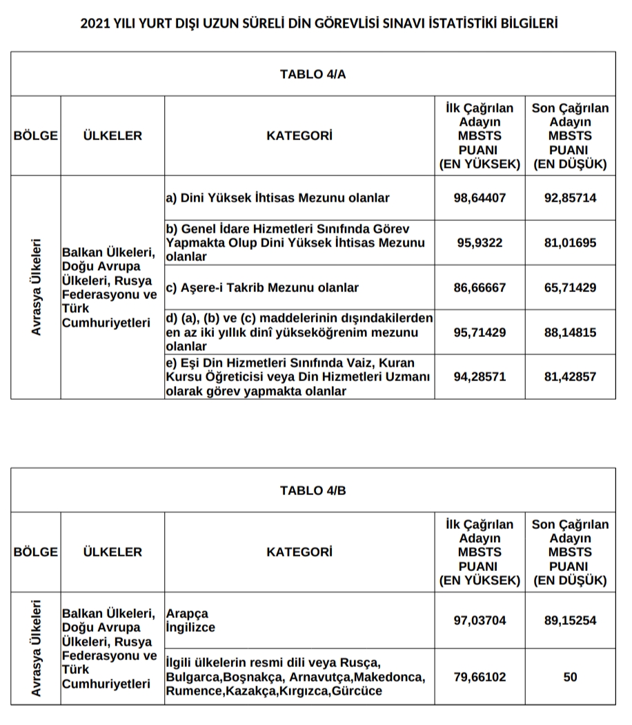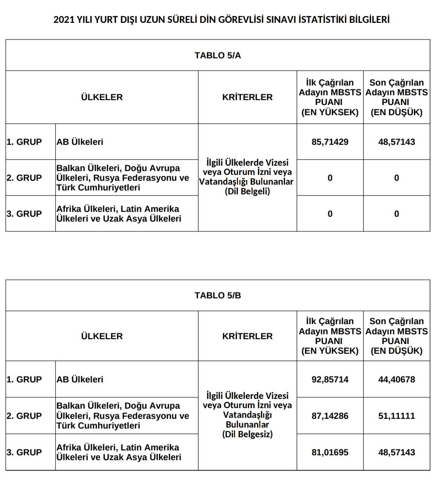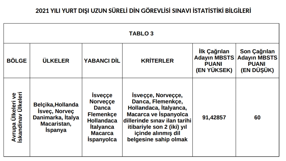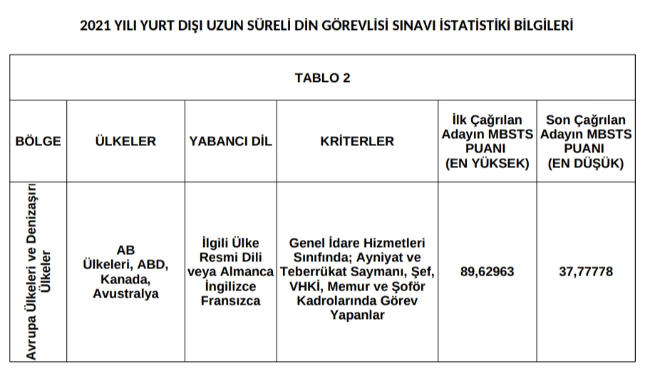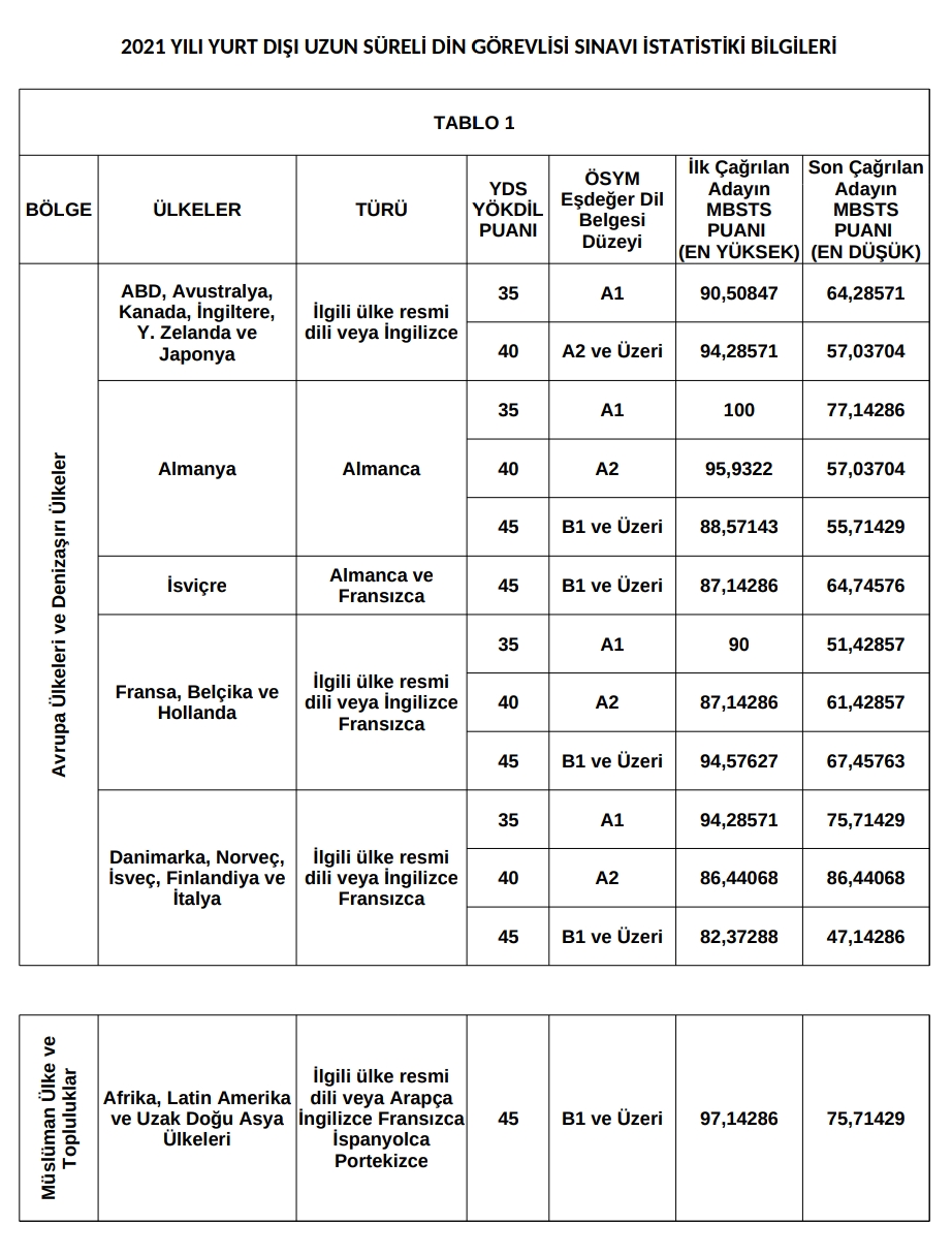 Diyanet İşleri Başkanlığınca, yurt dışında görevlendirilmek üzere açılan "Yurt Dışı Uzun Süreli Din Görevlisi Sınavı" istatistiki bilgileri şöyle: