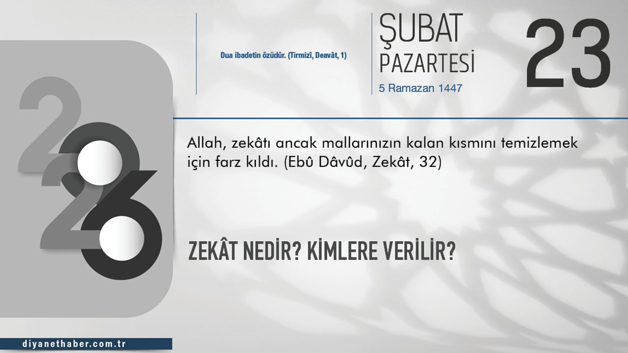 Zekât, dinen zenginlik ölçüsü kabul edilen miktarda (nisap) mala sahip olanların Allah rızası için belirli kişilere vermesi gereken belli miktarı ifade eder. Zekâtın farz olması için; malların nisaba ulaşması, hakikaten ya da hükmen artıcı olması, sahip olunduğu andan itibaren üzerinden bir yıl geçmesi, bir yıllık borçtan ve asli ihtiyaçlardan fazla olması gerekir. Nisap miktarı; altında 80.18 gr, devede 5, sığırda 30, koyun ve keçide 40 adettir. Zekât; fakirlere, miskinlere, zekât toplamakla görevli olanlara, kalpleri İslam’a ısındırılmak istenenlere, esaretten kurtulacaklara, borçlulara, Allah yolunda cihad edenlere ve yolda kalmış olanlara verilir. (Tevbe, 9/60) Hanefîler’e göre şunlara zekât ve fitre verilmez: a) Ana, baba, büyük anne ve büyük babalara, b) Oğul, oğlun çocukları, kız, kızın çocukları ve bunlardan doğan çocuklara, c) Eşe, d) Müslüman olmayanlara, e) Zengine yani asli ihtiyaçları dışında nisap miktarı mala sahip olan kişiye, f) Babası zengin olan ergen olmamış çocuğa.