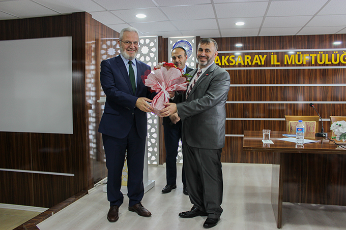 Toplantı sonunda Aksaray İl Müftüsü Cemalettin Bal, Başkalık Müşaviri Ömer Aydın'a çiçek takdiminde bulundu.